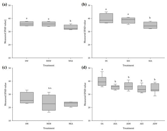 Chlorophyll content of (a) wheat, (b) soybean, (c) maize, and (d) ragweed in dependence of the emitting plant species, n = 14; different letters indicate significant differences, n.s. no statistically significant differences were detected among treatments. Abbreviations: OW = unexposed wheat, WEW = wheat exposed to wheat, WEA = wheat exposed to ragweed, OS = unexposed soybean, SES = soybean exposed to soybean, SEA = soybean exposed to ragweed, OM = unexposed maize, MEM = maize exposed to maize, MEA = maize exposed to ragweed, OA = unexposed ragweed, AEA = ragweed exposed to ragweed, AEM = ragweed exposed to maize, AES = ragweed exposed to soybean, AEW = ragweed exposed to wheat.