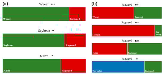 Root growth behavior of (a) crops (wheat, soybean, and maize) when exposed to root exudates of conspecifics or ragweed and (b) ragweed when exposed to root exudates of conspecifics, crops (wheat, soybean, and maize), or tap water; n = 40; significance levels: * p < 0.05, ** p < 0.01, *** p < 0.001, n.s. no statistically significant differences among treatments.