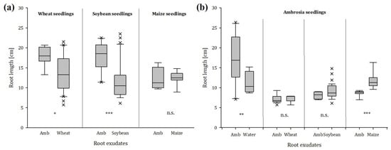 Root length of (a) crops (wheat, soybean, and maize) when exposed to root exudates of conspecifics and ragweed (Amb) and (b) ragweed when exposed to root exudates of conspecifics, crops (wheat, soybean, and maize), or tap water; n = 40; significance levels: * p < 0.05, ** p < 0.01, *** p < 0.001, n.s. no statistically significant differences among treatments.