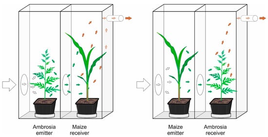 In the first run, the exposure of the crops to the volatiles of a conspecific or ragweed was performed in a series of “twin-chamber cages” to ensure that the only source of information for the plant kin recognition were the volatile organic compounds emitted by the various neighboring plants [10,11,66,68].