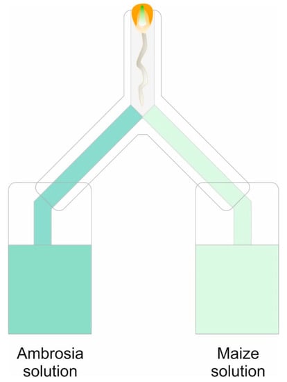 A root choice experiment was conducted in the laboratory of the University of Natural Resources and Life Science Vienna following the protocol of Elhakeem et al. [10]. In this experiment, we tested the ability of the roots of germinated crop seedlings to choose between two spatial growth niches that contained root exudates of either a conspecific or ragweed. To obtain the root exudates, seeds of all crops and ragweed were germinated in Petri dishes with light cycle intervals of 12 h and a temperature of 20 °C. During the dark phase, the temperature dropped to 15 °C. When the radicle was approx. 2 cm long, seedlings were transferred to glassy laboratory buckets (500 mL) filled with half-strength Hoagland solution (HH2395-10L, Sigma-Aldrich) dissolved in distilled water. We prepared two buckets for each plant species in order to gain 1000 mL of root exudate for each one. To prevent volatile interactions between plants in neighboring buckets, they were separated into different growing chambers.