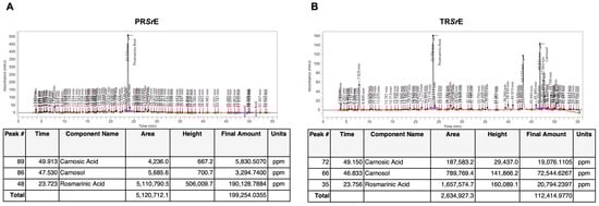 As shown by the chromatograms, PRSrE was abundant in rosmarinic acid (19%) and had a lower concentration in terpenoids (0.6% carnosic acid and 0.3% carnosol, Figure 2A), while the major component in TRSrE was carnosol (7.2%) followed by rosmarinic acid (2%) and carnosic acid (1.9%, Figure 2B).