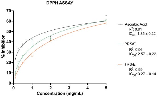 DPPH Assay. Antiradical scavenging activity expressed as % inhibition and IC50 values of PRSrE and TRSrE. Ascorbic Acid was used as positive control. Data were fitted with nonlinear regression to quantify the IC50 values. The results are expressed as mean ± SEM (n = 3).