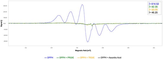 As shown in Figure 4, the DPPH-EPR spectrum highlighted a six-line pattern with an integrated spectral area value of 614.52 a.u. Although both S. rosmarinus Spenn. extracts showed DPPH radical scavenging capacity, the PRSrE showed a higher antioxidant capacity with a scavenger percentage equal to 93.11% (∫ = 42.35 a.u., Figure 4) compared to the TRSrE (∫ = 53.05 a.u., scavenger percentage 91.37%, Figure 4). As the positive control, the integrated spectral area value and the scavenger percentage of ascorbic acid were 46.25 a.u. and 92.47%, respectively (Figure 4).