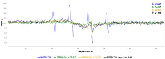 In regard to the evaluation of the scavenging activity against hydroxyl radical (•OH), the EPR showed the typical 4-line spectrum of a BMPO-•OH adduct with an integrated spectral area value of 43.05 a.u.
