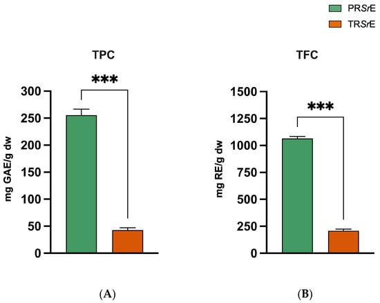 Regarding the flavonoid content, the PRSrE showed a TFC of 1065 ± 18.83 mg RE/g dw, and the TRSrE showed a TFC of 208.4 ± 16.33 RE/g dw. Butu et al. achieved TFC values of 337.97 ± 0.50 mg RE/g and 243.63 ± 0.17 mg RE/g via Soxhlet and percolation methods, respectively [59].