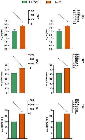 The Pearson’s correlation analyses showed that both the TPC and TFC were related with antioxidant activity (DPPH assay, DPPH-EPR, BMPO-•OH-EPR). Indeed, as shown in Table 1, a strong correlation was found between the antioxidant activity and TPC (r: −0.975, p < 0.001) and TFC as well (r: −0.993, p < 0.001). Therefore, the higher antioxidant activity exerted by the PRSrE compared to the TRSrE was due to the higher TPC and TFC in the aqueous extract (Figure 7).