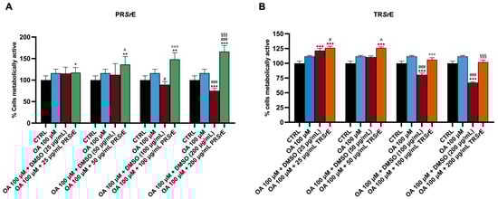 MTT assay for cell viability. Cell viability in response to exposure to OA 100 μM, vehicle (DMSO) or treatment with increasing concentrations of (A) PRSrE or (B) TRSrE. The results are expressed as mean ± SEM; *: p < 0.05, **: p < 0.01, ***: p < 0.001 vs. CTRl; #: p < 0.05, ###: p < 0.001 vs. OA 100 μM; ^: p < 0.05 vs. OA 100 + DMSO (50 μg/mL); °°°: p < 0.001 vs. OA 100 + DMSO (100 μg/mL); §§§: p < 0.001 vs. OA 100 + DMSO (200 μg/mL).
