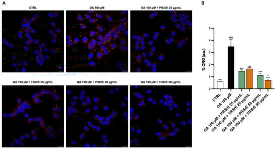 Total fatty acid accumulation assessed using Oil Red O (ORO) staining. (A) Representative confocal images of OA-induced lipid accumulation in McA-RH7777. (B) The results are expressed as mean ± S.E.M.; ###: p < 0.001 vs. CTRL; ***: p < 0.001 vs. OA 100 µM; °: p < 0.05 vs. OA 100 µM + PRSrE 50 µg/mL.