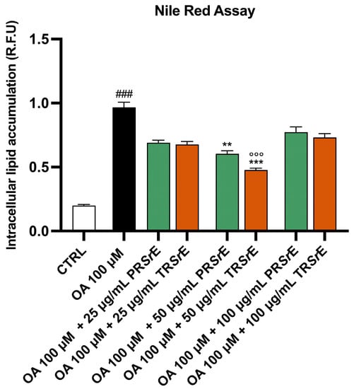 Total fatty acid accumulation assessed via Nile Red assay. Intracellular lipid accumulation in McA-RH7777. The results are expressed as mean ± S.E.M. ###: p < 0.001 vs. CTRL; **: p < 0.01; ***: p < 0.001 vs. OA 100 µM; °°°: p < 0.01 vs. OA 100 µM + PRSrE µg/mL.