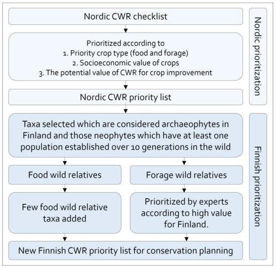 The original Finnish priority list [17] included also threat status as a prioritization criterion. That was not included this time as much more data on utilization potential were available and because many threatened species already have conservation actions in place. Those taxa related to food crops from the Nordic priority list that are present in Finland as archaeophytes or established neophytes were included in the new Finnish priority list. The taxa in the Nordic priority list which do not occur in Finland, only occur in Finland as escapees from cultivation or have been established in the wild less than 10 generations were not included. The forage wild relatives were also considered a priority in Finland but were re-prioritized by national experts in accordance with their importance to the national forage cultivation and breeding at present and potentially in the future. In addition to the changes regarding forage CWR priorities, a few food wild relative species were added to the new Finnish list which were on the original Finnish list but not on the Nordic priority list as they were considered important by national experts. The process is summarized in Figure 1. After prioritization, the national threat status of the priority taxa was checked as the threat status may affect conservation actions.