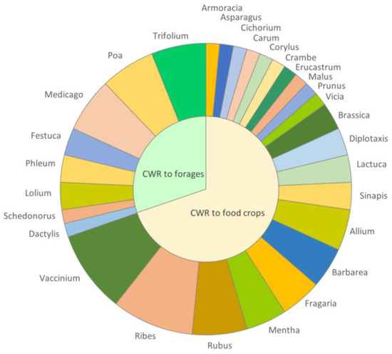 The list includes relatives to vegetable, fruit, berry, nut, spice, and forage grass and legume crop groups. The wild relatives of vegetables are in the primary or secondary gene pool of, for example: cabbage, broccoli, cauliflower, chives, asparagus, turnip, endive and broad bean. Some of the priority CWR are closely related to fruits and/or berries such as cultivated apples, plums, currants, gooseberries, raspberries and blueberries. The list also includes species related to nuts and spices, such as hazelnut, caraway, chives, mustard and mints. Most important forage legumes and grasses for breeding, such as fescues, ryegrasses, bluegrasses, clovers, medicks and timothies are included. All the genera in the priority list grouped into food and forage categories are shown in Figure 2.