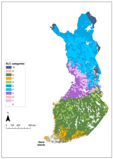 The general ecogeographic land characterization (ELC) map was developed for the 56 Finnish CWR priority species (Figure 3). All conservation planning was conducted on a species rather than taxon level because in that way more comprehensive observation data could be used. The ELC categories were used in the in situ complementary analysis to identify potential genetic reserve sites within existing PAs to maximise the diversity conserved in protected areas, and in the ex situ complementary analysis to find multi-species collecting sites for filling the gaps and to maximise the diversity in ex situ seed collections. See Supplementary Material Table S1 for information on the ELC categories.