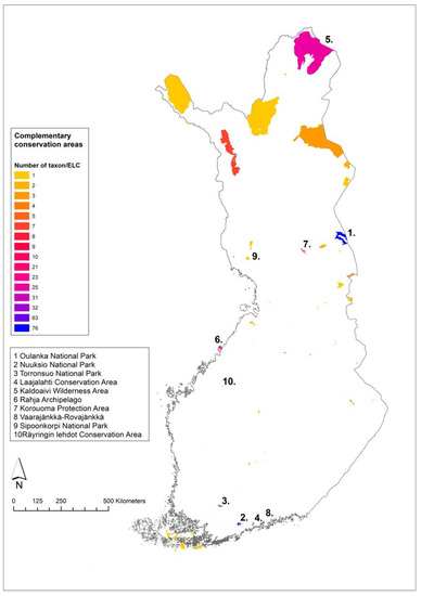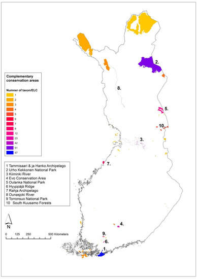 The first and second sites from the mainland Finland analysis were Oulanka National Park with 73 species/ELC combinations and Nuuksio National Park with 62 combinations (Table S2). From the Åland–mainland Finland analysis, Tammisaari and Hanko Archipelago area was first with 57 Finnish complementary species/ELC combinations and Urho Kekkonen National Park second with 51 combinations (Table S3).