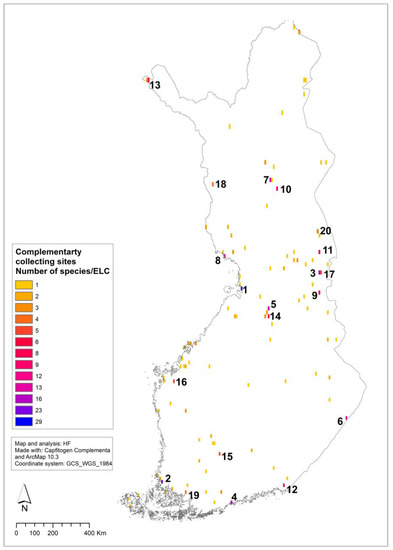 The PA complementary analyses were used to identify a minimum number of sites within existing PAs complementary to each other with a maximum number of CWR species, taking into consideration the ecogeographic diversity identified in the ELC map categories (i.e., species/ELC category combinations). The analyses were conducted with the Complementa tool of the Capfitogen tools. For the mainland Finland analysis, protected area shapefiles from Parks and Wildlife Finland were used. These included the existing national PA designations and those areas planned to be protected within the near future. For the analysis including Åland Islands, the World Database of Protected Areas [30] was used on the resolution of 30 arc-s (~1 km2). This dataset also included regional and international PA designations, such as UNESCO Biosphere Reserves, HELCOM and Ramsar sites.