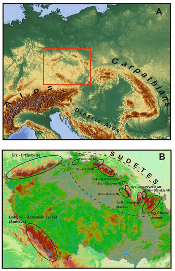In relation to mountain ranges, research on the distribution and genetic variation of populations of organisms has a long history in the Alps. This has led to, among other things, the verification of many research hypotheses regarding biogeography, glacial refugia, fluctuations of plant ranges, or recolonization and migration during the Pleistocene and post-glacial periods [26,39,40]. Ref. [38] further noted that, unlike the Alps, in other mountain ranges, the biogeographical aspects of species migrations have not been extensively studied. This includes the Carpathians, Pyrenees, Apennines, Scandinavian Mountains, and Balkan Peninsula, as well as smaller mountain ranges. This group also includes the Hercynian Mountains, old mountains formed in the Paleozoic, and secondary alpine orogens that folded over time. Nevertheless, they are an important element of the European mountain system, playing a significant but relatively poorly recognized biogeographical role on the continent. Biogeographically, the Hercynian Mountains are located at the “crossroads” of European mountain ranges, ranging from Scandinavia and the Carpathians through the Alps to the Pyrenees, Apennines, and mountains of the Balkan Peninsula (Figure 1A,B).