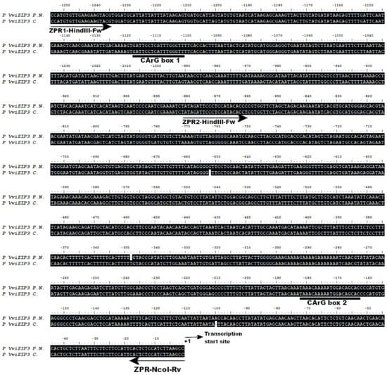 Comparison between nucleotide sequences of VviZIP3 promoter in Pinot Noir (P.N) and Carmenérè (C). Identical amino acids are highlighted in black, dashes are deletions or insertions, and the location of the CArG boxes are underlined with black lines under the sequences. Black arrows represent ZPR primers. ZPR1-HindIII-Fw and ZPR-NcoI-Rv amplify the PZIP3Δ1 fragment. ZPR2-HindIII-Fw and ZPR-NcoI-Rv amplify the PZIP3Δ2 fragment. The transcription start site is labeled.