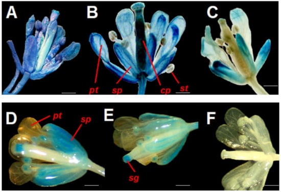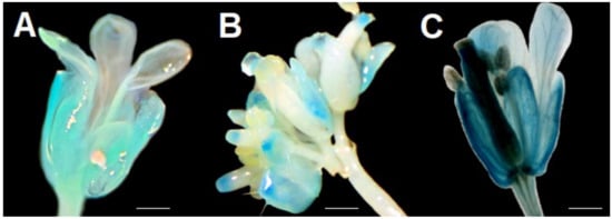 The results of GUS histochemical staining using fragments with site-directed deletions (pPZIP3Δ3, pPZIP3Δ4, and pPZIP3Δ5) appear in Figure 3D–F; these images show a change in staining pattern when compared with Figure 3B,C. Figure 3D,E show a distinctive pattern with blue coloration in sepals, stamens, and stigma, with the coloration being slightly more intense in 3D. This difference in intensity of coloration in floral tissue is observed in the measurement of GUS expression via qRT-PCR (Figure 4); in Figure 3F no blue coloration is observed.