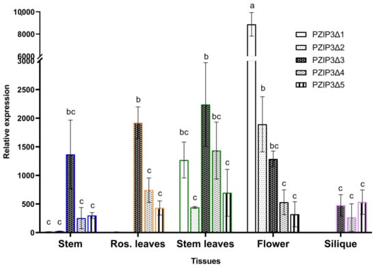 Expression analysis of GUS gene via qRT-PCR with constructs pPZIP3Δ1::GUS, pPZIP3Δ2::GUS, pPZIP3Δ3::GUS, pPZIP3Δ4::GUS, and pPZIP3Δ5::GUS in different A. thaliana tissues. Analysis of GUS expression was normalized with expression levels of F-box and UBQ10. GUS expression levels in transgenic plants were compared with GUS expression levels from a wild-type plant. Data represent the mean ± SD (n = 3). Different letters indicate significant differences between the control and samples at each sampling time (p < 0.05).