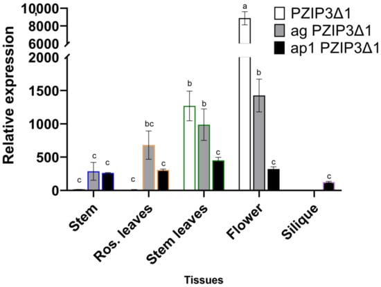 GUS gene expression analysis via qRT-PCR in wild-type (white bars), ag (grey bars), and ap1 (black bars) mutants containing the pPZIP3Δ1::GUS construct in different A. thaliana tissues. Analysis of GUS expression was normalized with expression levels of F-box and UBQ10. GUS expression levels in transgenic plants were compared with GUS expression levels from a wild-type plant. Data represent the mean ± SD (n = 3). Different letters indicate significant differences between the control and samples at each sampling time (p < 0.05).