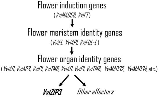 Summary of the proposed involvement of VviZIP3 in the floral development of grapevines. The sequential steps of molecular control of flowering and some examples of characterized genes that are involved in this process are shown.