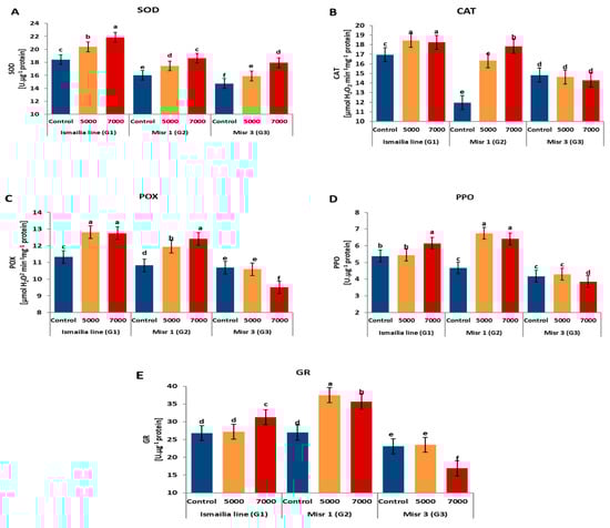 Effects of salinity treatments (control, 5000 ppm and 7000 ppm) on SOD-superoxide dismutase. (A) CAT: catalase, (B) POX: peroxidase, (C) PPO: Polyphenol oxidase, (D) GR: Glutathione reductase and (E) activities. Different letters differ statistically based on Tukey’s HSD test (p < 0.05).