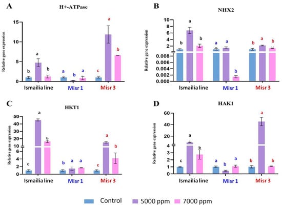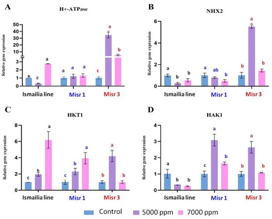 The results showed that, in the root, the H+-ATPase gene was up-regulated in the Ismailia line and in Misr 3 genotypes by 4- and 11-fold at 5000 ppm, respectively, and by 6-fold at 7000 ppm in the Misr 3 genotype (Figure 2A). On the other hand, H+-ATPase expression was down-regulated in Misr 1 in both 5000 ppm and 7000 ppm treatments. However, in leaves, the expression level was up-regulated by 2.8-fold at 7000 ppm in the Ismailia line and by 34- and 5-fold in Misr 3 genotype at 5000 ppm and 7000 ppm, respectively. On the other hand, H+-ATPase expression level was not significantly up-regulated in the Misr 1 genotype compared with the control plants (Figure 3A). The NHX2 gene in roots was up-regulated by 2- and 7-fold in the Ismailia line at 7000 ppm and 5000 ppm, respectively. In the Misr 1 genotype, its expression level was not up-regulated compared with the control plants. Interestingly, its expression level at 7000 ppm was sharply down-regulated. In Misr 3, the expression level was up-regulated by 2-fold at 5000 ppm, with no significant response compared to the control plants at 7000 ppm (Figure 2B). In leaves, the NHX2 expression level was down-regulated in both the Ismailia line and Misr 1, while being up-regulated by 5-fold at 5000 ppm in the Misr 3 genotype (Figure 3B). For the Ismailia line, expression levels of HKT1 in roots were up-regulated by 45- and 16-fold at 5000 ppm and 7000 ppm, respectively. On the other hand, Misr 3 was up-regulated by 15- and 4-fold at 5000 ppm and 7000 ppm, respectively, but in the Misr 1 genotype, the expression was up-regulated by 1.8- and 2-fold at 5000 ppm and 7000 ppm, respectively (Figure 2C). In leaves, the expression level of HKT1 was up-regulated by 2-, 2.3-, and 4-fold in the Ismailia line, Misr 1, and Misr 3 genotypes, respectively, at 5000 ppm and up-regulated by 6- and 4-fold in Ismailia and Misr 1, respectively, at 7000 ppm (Figure 3C). In roots, the expression level of HAK1 was up-regulated by 9- and 45-fold in the Ismailia line and Misr 3 genotype, respectively, and down-regulated in Misr 1 at 5000 ppm. On the other hand, the expression level was up-regulated by 3-fold in the Ismailia line while in Misr 1 and Misr 3 genotypes, the expression was almost the same as the control plants at 7000 ppm treatment (Figure 2D). In leaves, the HAK1 expression level was up-regulated by 3- and 2-fold in the Misr 1 and Misr 3 genotypes, respectively; in contrast, in the Ismailia line, the expression level was down-regulated at 5000 ppm and 7000 ppm (Figure 3D).