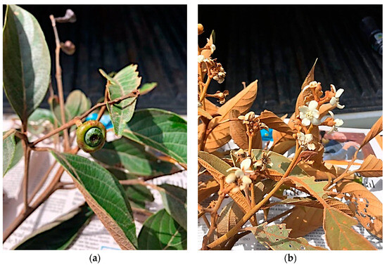 Nectandra laurel Klotzsch ex Nees at the collection site; (a) fruits and leaves, (b) flowers and leaves (Photo by Nixon Cumbicus).