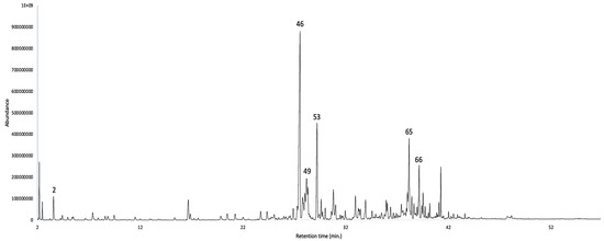 According to the chemical composition, the EO was dominated by sesquiterpene hydrocarbons (53.0–53.8%), followed by oxygenated sesquiterpenoids (18.9–19.0%). A third main group was constituted by metabolites of other origins, mainly aliphatic compounds, apparently derived from the acetate pathway (11.7–8.5%). The major components of the EO (≥3.0% with at least one column) were δ-selinene (30.5–28.8%), δ-cadinene (5.4–6.4%), epi-α-cadinol (4.9–5.2%), an undetermined compound with a molecular weight of 204 (peak 49, 3.4–4.2%), α-pinene (3.3–2.9%), and α-cadinol (2.9–3.0%). The detailed chemical composition is reported in Table 1, whereas the gas chromatography-mass spectrometry (GC-MS) profiles with both columns are represented in Figure 2 and Figure 3.