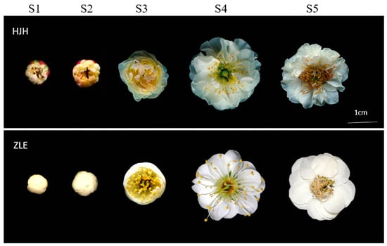Phenotypes of P. mume ‘HJH’ and ‘ZLE’ flowers. ‘HJH’ means P. mume ‘Huangjinhe’ and ‘ZLE’ means P. mume ‘Zaolve’; S1, S2, S3, S4 and S5 represent small bud stage, big bud stage, half-flowering stage, whole-blooming stage and terminal florescence, respectively. The bar means 1 cm at the bottom-right corner.