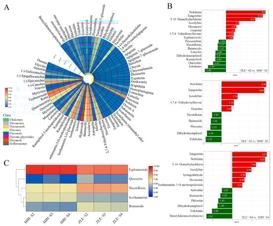 Differential flavonoid metabolites analysis between ‘HJH’ and ‘ZLE’ flowers. (A) Heatmap of the types and levels of flavonoids in two varieties at different stages. The colorful scales represent different classes. (B) Differential flavonoid metabolites in 3 comparison groups. (C) Heatmap of the main differential flavonoids in ‘HJH’ and ‘ZLE’ (contents > 10 μg/g DW). The colorful heatmap cells refer to the content of metabolites. Red to blue represents high to low content.