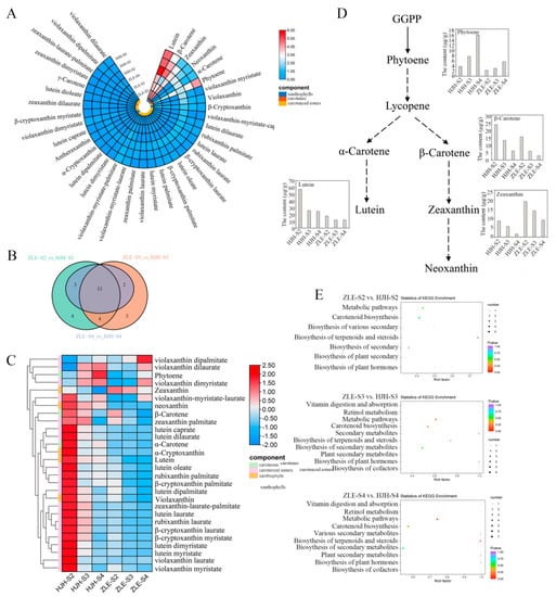 Differential carotenoids metabolites analysis of P. mume ‘HJH’ and ‘ZLE’ flowers. (A) Heatmap of the types and levels of carotenoids in two varieties at different stages. (B) Venn diagram of carotenoid metabolites. (C) Heatmap of differential carotenoid metabolites contents. The colorful scales represent different classes. The colorful heatmap cells mean content of metabolites. Red to blue represent high to low content. (D) The contents of major differential carotenoids (contents > 10 μg/g DW). (E) KEGG enrichment analysis of differential carotenoid metabolites.