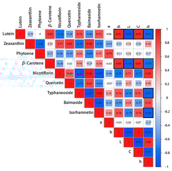 To study the contribution of different pigments to the coloration of yellow flowers, fourteen indicators that included the L*, a*, b*, C* and h value, five major differential flavonoids and four major differential carotenoids were selected. We analyzed the correlation among the fourteen indicators by calculating their Pearson correlation coefficients and visualized the results using a correlation heat map (Figure 4). The results indicate a highly significant negative correlation (p < 0.01) between the L* value and lutein, as well as a significant negative correlation (p < 0.05) with β-carotene. However, none of the five major differential flavonoids were found to have a significant correlation with the L* value. The b* and C* values were found to have a significant positive correlation with lutein and β-carotene (p < 0.05), while no significant correlation was observed between these values and the five major differential flavonoids. The h value exhibited a significant negative correlation (p < 0.05) with lutein, β-carotene, typhaneoside and isorhamnetin-3-O-neohespeidoside. There was no significant correlation observed between the a* value and the differential flavonoids or differential carotenoids. The correlation results indicated that the levels of carotenoids and flavonoids were both closely associated with the color of flower in P. mume. This suggests that these compounds play a significant role in determining the flower coloration of P. mume.