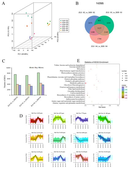 Transcriptome quality analysis of P. mume ‘HJH’ and ‘ZLE’ at S2, S3 and S4. (A) Principal component analysis of samples. (B) Venn diagrams of DEGs among different groups. (C) The number of DEGs. (D) Top 20 KEGG pathways enrichment analysis. (E) K-means cluster analysis of gene expression. The x-axis means samples, and the y-axis denotes gene expression of centralization and standardization. Different classes are expressed by colored lines. The samples with the same color represent three biological replications of the same period.