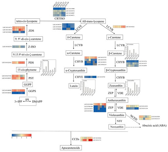Structural genes of carotenoid biosynthesis pathway in P. mume ‘HJH’ and ‘ZLE’. GGPS, geranylgeranyl diphosphate synthase; PSY, phytoene synthase; PDS, phytoene desaturase; ZDS, ζ-carotene desaturase; CRTISO, carotenoid isomerase; ZISO, 15-cis-zeta-carotene isomerase; LCYE, lycopene epsilon cyclase; LCYB, lycopene beta cyclase; CHYE, carotene epsilon-monooxygenase; CHYB, beta-carotene hydroxylase; ZEP, zeaxanthin epoxidase; VDE, violaxanthin de-epoxidase; NSY, neoxanthin synthase; CCD, carotenoid cleavage dioxygenases; NCED, 9-cis-epoxycarotenoid dioxygenase. The colored scale represents the relative expression levels. Red means high expression, while blue means low expression.