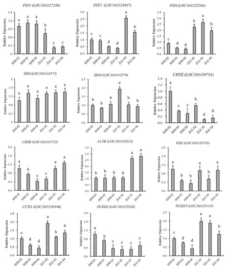 To further verify the above results, we randomly studied 12 genes involved in the carotenoid synthesis pathway for qRT-PCR analysis. The results show that gene-expression trends were consistent with the transcriptome data (Figure 7).