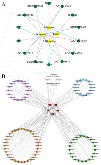 Comprehensive analysis of metabolome and transcriptome has increasingly become a popular and practical tool for exploring new genes that may participate in various metabolic pathways []. This study combined metabolome and transcriptome data to clarify the correlation between genes and carotenoids in P. mume. This provides valuable information for studying the accumulation and regulation of carotenoids. Five genes that were significantly related to lutein and β-carotene were screened through correlation network analysis (PSY, CRTISO, CHYE, ZEP and CCD4). Mainly, CCD4 was both correlated with lutein and β-carotene. Furthermore, a significant negative correlation between CCD4 gene and metabolites was found. We guessed that CCD4 might play a key role in carotenoid accumulation.