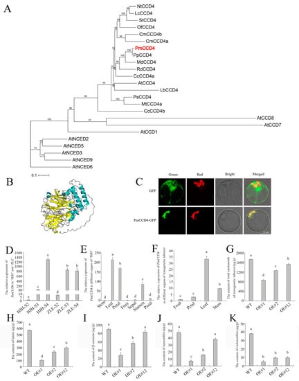 Analysis and function of PmCCD4. (A) Phylogenetic tree of CCD proteins from different plants. The GenBank accession numbers of the CCD proteins were as follows: Arabidopsis thaliana AtCCD1 (NP191911.1), AtCCD4 (NP193652.1), AtCCD7 (NP182026.5), AtCCD8 (NP195007.2), AtNCED2 (NP193569), AtNCED3 (NP_188062.1), AtNCED5 (NP_174302.1), AtNCED6 (NP_189064.1), AtNCED9 (NP_177960.1); Citrus clemetina CcCCD4a (DQ309330), CcCCD4b (DQ309331); Chrysanthemum morifolium CmCCD4a (ABY60885), CmCCD4b (BAF36656); Lilium brownie LbCCD4 (AB733097); L. chinense LcCCD4 (KM016897); Malus domestica MdCCD4 (ABY47995.1); Medicago truncatula MtCCD4a (XP003612460); Nicotiana tabacum NtCCD4 (AEI61930.1); Osmanthus fragrans OfCCD4 (ABY60887.1); P. persica PpCCD4 (AGL08676.1); Pisum sativum PsCCD4 (BAC10552); Rosa damascena RdCCD4 (ABY60886); Solanum tuberosum StCCD4 (XM_006359904.2); PmCCD4 is represented in red. (B) Predicted 3D structure of PmCCD4 protein. teal-helix represents α-helices; yellow-sheet represents β-sheet; gray line represents loop. (C) Subcellular localization of PmCCD4 protein. Green, GFP channel; Red, plastid; Bright, bright field image; Merged, merged image. (D) The expression level of PmCCD4 in ‘HJH’ and ‘ZLE’. (E) The expression level of PmCCD4 in different organs of ‘HJH’. (F) The expression level of PmCCD4 in different organs of transgenic tobacco lines. (G) The total carotenoid content of three transgenic tobacco lines (OE-1, OE-2 and OE-12). (H–K) The contents of lutein, β-carotene, neoxanthin and violaxanthin of three transgenic tobacco lines (OE-1, OE-2 and OE-12). Standard deviation error bars represent three independent replicates. Statistically significant differences (p < 0.05) are denoted by different letters (a–e).