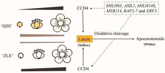 Carotenoid biosynthesis is strictly regulated in plants, and transcription factors play an important role. Previous reports showed that CsMADS5, CsMADS6 and CsERF061 in citrus [,,], UpMYB44 in Ulva prolifera [], MdAP2-34 in M. domestica [] and SlNAC1, SlNAC4, SlAP2a, and SlBBX20 in Solanum lycopersicum [,,,] could directly interact with the carotenoid synthesis gene to regulate carotenoid accumulation. In P. mume, the transcriptional regulation mechanism of carotenoids is unclear, hindering the germplasm innovation of flower color. To explore the potential regulatory network of flower color differences, co-expression analysis was carried out between carotenoid pathway genes and differentially expressed transcription factors (TFs). There were 93 TFs of 19 TF families that had a significant correlation with five genes. And bHLH family (21 unigenes) was the most abundant. bHLH families, which belong to superfamily transcription factors, are widely spread in plants []. In Carica papaya, CpbHLH1 and CpbHLH2 combine with downstream structural genes CpCYCB and CpLCYB to activate or transcribe, respectively []. Among the 93 TFs, 33 were involved in the regulation of CCD4. bHLH63, ASIL1, bHLH148, MYB114, RAP2-7 and ERF3 were positively correlated with CCD4. we conjectured that the six TFs probably regulated CCD4 to affect the accumulation of lutein and β-carotene. Especially, the bHLH63, which belongs to the bHLH family, had the strongest connection with CCD4. Notably, AtCIB1 (AT4G34530) and AtTOE1 (AT2G28550) were the bHLH63 and RAP2-7 homologous protein in Arabidopsis. AtCIB1 interacts with AtCRY2 (cryptochrome 2) to positively regulate flower development in Arabidopsis []. AtTOE1 was involved in the timing of flowering in Arabidopsis []. We considered it would be a significant study to determine the relationship between these transcription factors and carotenoids through PmCCD4. Meanwhile, it also provides the scientific basis for the innovation of flower color breeding in Prunus.