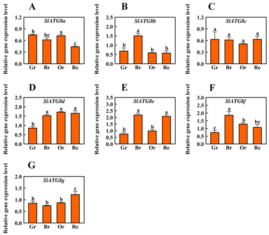 Differential Expression Analysis of SlATG8s During Tomato Fruit Ripening. The expression profiles of SlATG8s during different stages of tomato fruit ripening are shown. The stages of fruit ripening are as follows: green ripe (Day 30), breaker (Day 35), orange ripe (Day 40), and red ripe (Day 45). Abbreviations: Gr—Green Ripe; Br—Breaker; Or—Orange Ripe; Re—Red Ripe. (A–G)—SlATG8a, SlATG8a, SlATG8b, SlATG8c, SlATG8d, SlATG8e, SlATG8f, SlATG8g genes relative expression. The presented data represent the mean values, and error bars represent the standard deviation. The same letter indicates no significant difference in mean values at p < 0.05 (Duncan’s test).