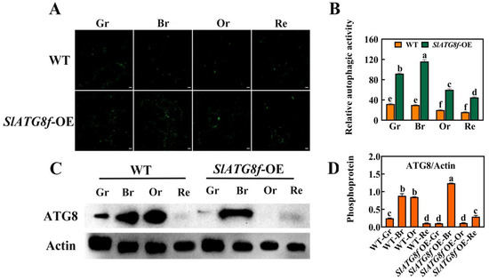 Effects of SlATG8f OE Plants on Autophagic Activity in Tomato Fruits. (A) Autophagosomes stained with MDC (green) in SlATG8f OE plants’ and WT fruits during different stages: green ripe (Gr), breaker (Br), orange ripe (Or), and red ripe (Re). Scale bars = 20 μm. (B) Relative autophagic activity quantified by counting the number of autophagosomes stained with MDC in each image from Panel A. (C) Western blot analysis of ATG8 protein expression in SlATG8f OE plants’ and WT fruits at different stages using Actin as a loading control. (D) Quantification of the intensity of each band from Panel C normalized to the intensity of the Actin band. ATG8/Actin ratio represents the relative expression of ATG8 protein. Abbreviations: white scale—20 μm; Gr—Green Ripe; Br—Breaker; Or—Orange Ripe; Re—Red Ripe; WT—Wild Type; SlATG8f-OE—SlATG8f overexpressing plants. The data shown are the mean values of three replicates, and the error bars represent the standard deviation. The same letter indicates no significant difference in mean values at p < 0.05 (Duncan’s test).