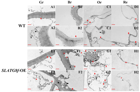 Effects of SlATG8f OE Plants on Autophagic Activity in Tomato Fruits. (A1–D2) Autophagic structures in WT tomato fruits at four stages of ripening. (E1–H2) Autophagic structures in SlATG8f OE plants’ tomato fruits at four stages of ripening. Scale bars = 2 μm. WT—Wild Type; SlATG8f-OE—SlATG8f overexpressing plants. Abbreviations: red scale—2 μm; Red arrows indicate autolysosomes (single-membrane structures with cytoplasmic components degraded), and black arrows indicate autophagosomes (double or multi-membrane vesicular structures containing cytoplasmic components). Gr—Green Ripe; Br—Breaker; Or—Orange Ripe; Re—Red Ripe; WT—Wild Type.