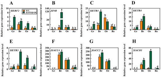 Effects of SlATG8f OE Plants on the Expression of Ethylene-Related Genes in Tomato Fruits. (A) qRT-PCR analysis of the expression of the ethylene signal transduction gene ERF2. (B–E) qRT-PCR analysis of the expression of ethylene receptor genes NR, ETR1, ETR4, and ETR3. (F–H) qRT-PCR analysis of the expression of ethylene synthesis genes ACC4, ACO1, and ACC2. Annotations: Gr—Green Ripe; Br—Breaker; Or—Orange Ripe; Re—Red Ripe; WT—Wild Type; SlATG8f-OE—SlATG8f overexpressing plants.The data shown are the mean values of three replicates, and the error bars represent the standard deviation. The same letter indicates no significant difference in mean values at p < 0.05 (Duncan’s test).