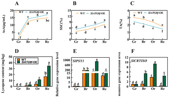 Effects of SlATG8f OE Plants on Pigment Accumulation, Soluble Solids, and Acidity in Tomato Fruits. (A) Ascorbic acid (AsA) content in tomato fruits. (B) Soluble solids (SSC) content in tomato fruits (expressed as a percentage). (C) Titratable acidity (TA) content in tomato fruits (expressed as a percentage). (D) Lycopene content in tomato fruits. (E,F) qRT-PCR analysis of the expression levels of lycopene synthesis genes SlPSY1 and SlCRTISO. qRT-PCR primer sequences are provided in Supplementary Table S1. Annotations: Gr—Green Ripe; Br—Breaker; Or—Orange Ripe; Re—Red Ripe; WT—Wild Type; SlATG8f-OE—SlATG8f overexpressing plants. The data shown are the mean values of three replicates, and the error bars represent the standard deviation. The same letter indicates no significant difference in mean values at p < 0.05 (Duncan’s test).