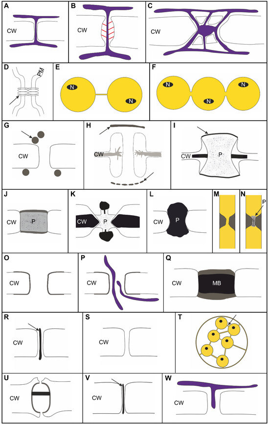 Diversity of cell connections. Canonical PD possess an ER-derived fixed desmotubule. (A) Young PD lack a visible cytosolic sleeve (Type I PD), while (B) older PD (Type II PD) show a visible cytosolic sleeve and the desmotubule is fixed by spoke-like tether proteins (red) [32,34]. (C) Old PD may also form complex branched structures with multiple interconnected orifices [32]. (D) Animals interconnect cells symplasmically via small protein-based gap junctions (arrow: connexin hexamer) [41], (E) membrane-lined tunnelling nano tubes (TNTs; N: nucleus) [42], and (F) larger intercellular bridges persisting postcytokinetically [43]. (G) Simple fungal septal pore associated with Woronin bodies (arrow) [44,45]. (H) More complex fungal dolipore (arrows: parenthesomes) [46]. Large single plugged pores of red algae (I) with and (J) without plug caps (arrow) [47]. Similar plugged pores in (K) Smithsoniella earleae (Chlorophyta) [48] and (L) Ctenocladus circinnatus (Ulvales, Ulvaphyceae) [49]. Siphonous Codium sp. (Bryopsidales, Ulvophyceae) forms (M) cytosolic pores and (N) plugs them [50]. Developing Volvox sp. (Chlamydomonadales, Chlorophyceae) colonies form (O) membrane-lined cytoplasmic bridges coated with a dense material of unknown nature (grey), which might be regarded as PDLCs and (P) are often traversed by ER strands [51]. Some species keep (Q) persistent cytoplasmic bridges at maturity which contain disc-shaped, layered medial bodies [52]. (R) PDLCs of some fungi and Chaetophoraceae species possess a central structure (arrow) that is not connected to the ER [53]. (S) More common algal PDLCs—e.g., in Phaeophyceae [54], Trentepohliales (Ulvophyceae) [49] and Chaetophorales (Chlorophyceae) [55,56]—are simple membrane-lined channels without an inner structure. (T) In the siphonocladous species Valonia ventricosa (Cladophorales, Ulvophyceae), the vacuole separates uninucleate domains which are interconnected by small cytoplasmic strands (arrow) [57]. (U) The PDLC of Oedogoniales are very different in size and shape. Globular particles are aligned at the membrane (grey) and an electron-dense band crosses the channel [58]. (V) Thin PDLCs of Coleochaete scutata (Coleochaetophyceae, Streptophyta) are traversed by a central structure without ER connection (see Section 4.5). (W) Temporary unilateral ER penetration in Chara vulgaris (Charophyceae, Streptophyta) PDLCs [59]. ER/desmotubule: violet, spoke-like tethers: red, CW: cell wall, MB: medial bodies, N: nucleus, P: plug, PM: plasma membrane.