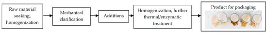 PBBs present various types, flavors, and range widely in market options. Their manufacturing process is rather long, especially compared to the one of dairy milk. Some of the steps include soaking, grinding, blanching (enzyme inactivation), centrifuging, thermal treatment (microbiological safety), and optional fortification. Figure 1 presents a simplified view of the processing steps of PBBs from farm to table.