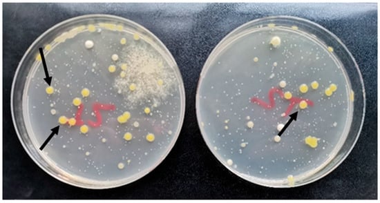 To confirm the presence of the pathogen in the droplets, we collected samples and cultivated them on petri dishes (see Section 4.4). After 72 h of cultivation, numerous colonies developed, some of which were typical for X. euvesicatoria 269p—yellow and mucoid (Figure 1). Species-specific PCR confirmed that the colonies were X. euvesicatoria. In control petri dishes, the pathogen was not found. These results clearly show that bacterial cells remained viable after the aerosolization process and could spread to neighboring healthy plants.