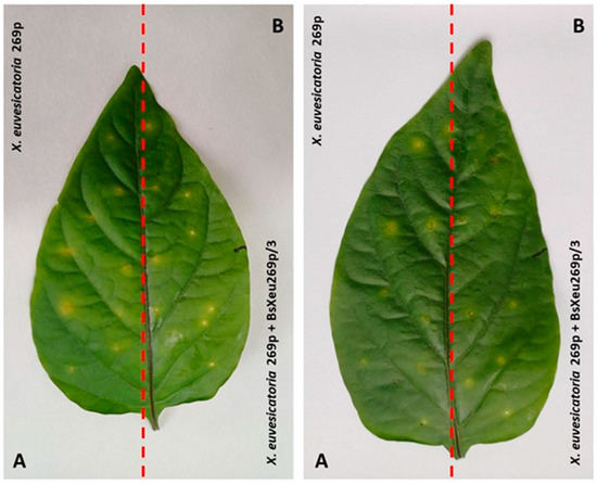 Approximately 7 dpi (day post inoculation), single yellow-green chlorotic circular lesions on the inoculation points occurred (Figure 3A). Ten days later, the lesions necrotized and changed in color from dark brown to black in the center. Finally, the process led to the drying of the leaves and plant defoliation. As seen in Figure 3B, treatment of the leaf surface with the BsXeu269p/3 bacteriophage slightly reduced the visible lesions.