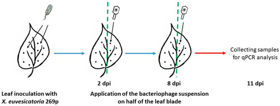 Scheme of MS II. Pepper plants (Capsicum annuum L., cv. Sofiiska kapia) were infected with X. euvesicatoria 269p (4 × 108 cfu/mL) by needle-pricking method. BsXeu269p/3 treatments were made at 2 and 8 dpi. The samples for TaqMan qPCR were collected at 11 dpi.