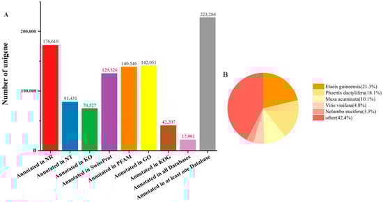 Information on unigenes annotated in different databases (A) and distributed in different species (B).